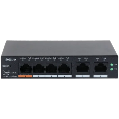 Dahua CS4006-4ET-60 является Layer 2 kompakts PoE tīkla slēdzis ar 4× Fast Ethernet PoE portiem un 2× Gigabit uplink portiem, paredzēts nelielām videonovērošanas un PoE ierīču instalācijām.