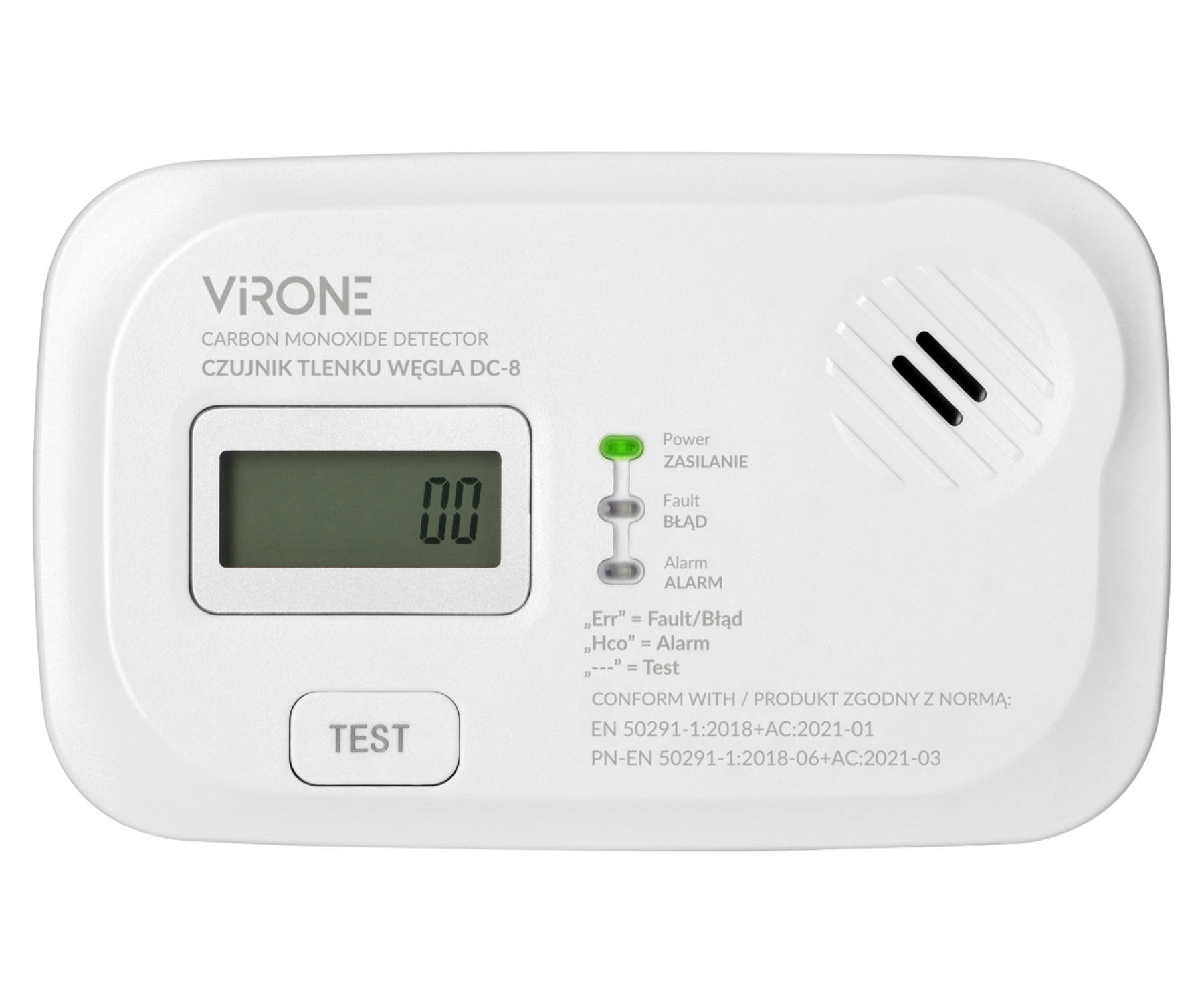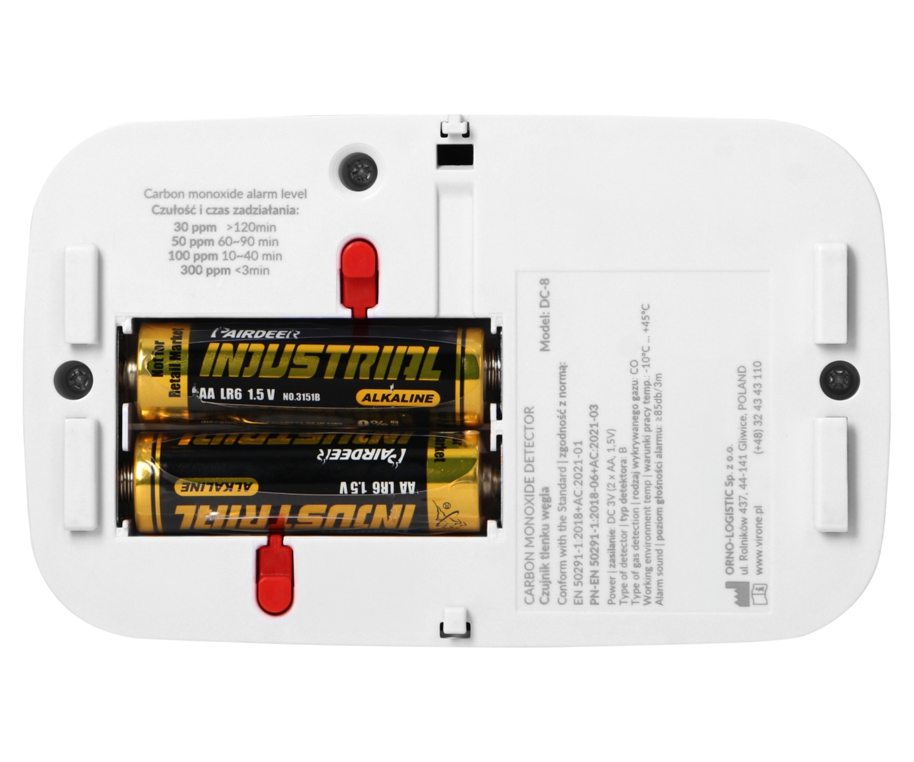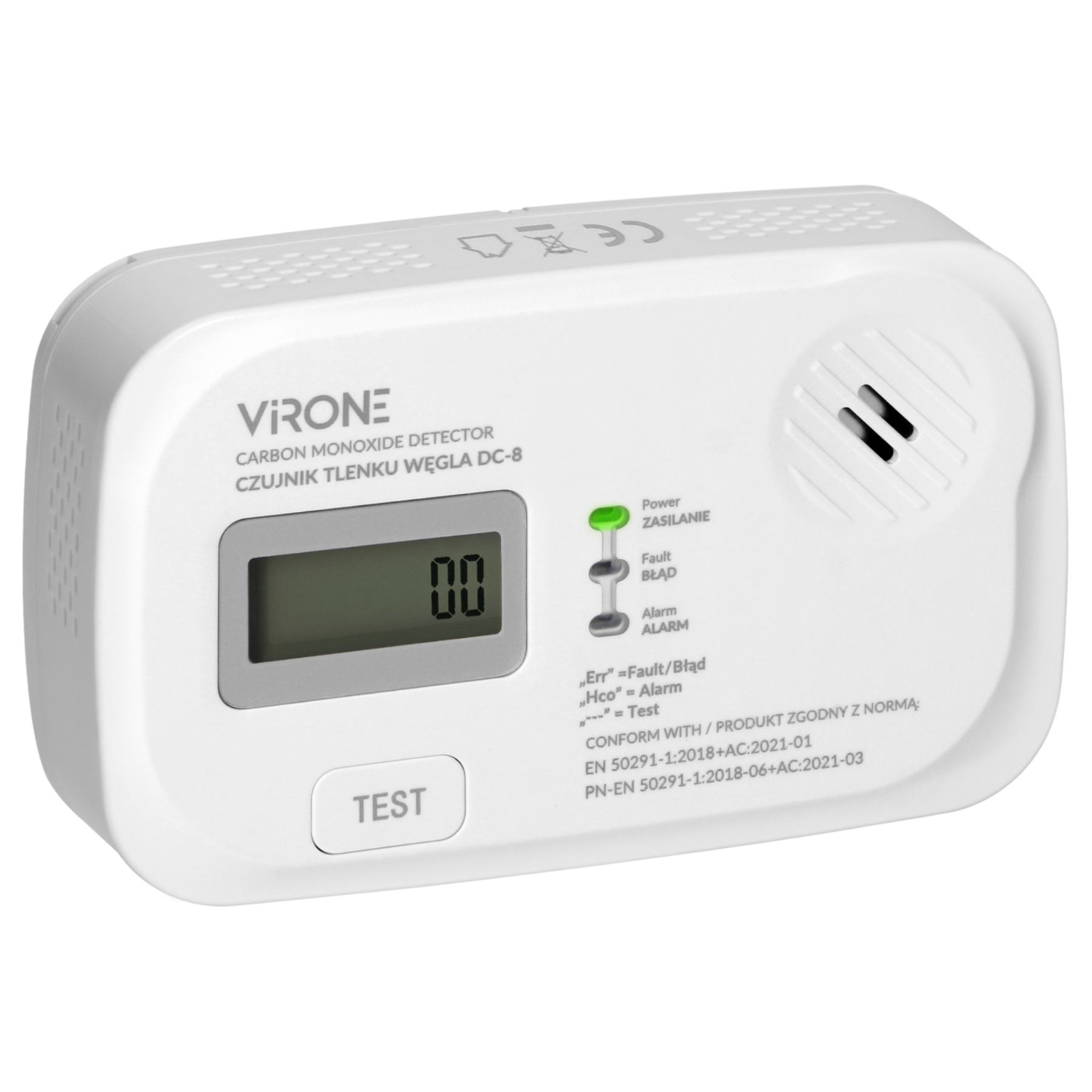 Elektroķīmisks oglekļa monoksīda detektors – Tips B Сигнализация: низкий уровень (> 40 ppm) / высокий уровень Diapazons : 10 … 550 ppm Функция подавления тревоги ЖК-дисплей Сирена тревоги > 85 дБ / 3 м Тестовый режим Низкий заряд батареи Аварийная сигнализация Ierīces sensora kalpošanas laika beigu indikācija Срок службы детектора: 10 лет PN-EN 50291-1:2018-06+AC:2021-03 atbilstība |