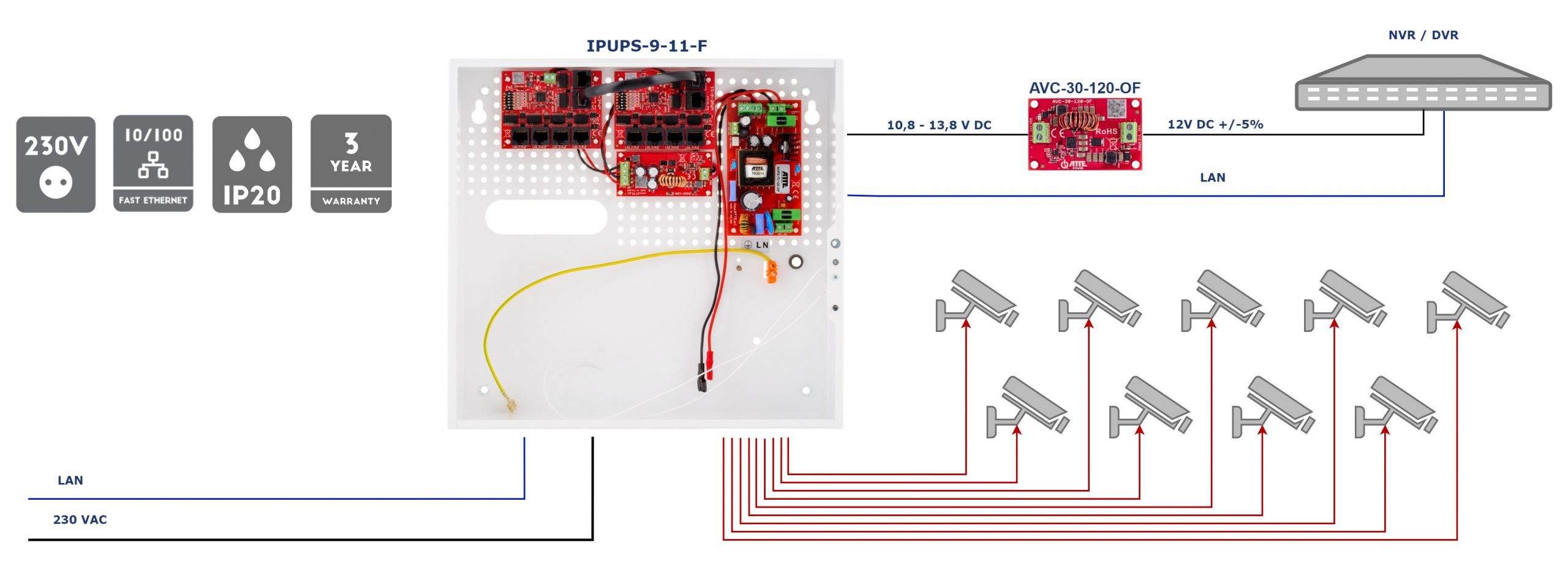 | Избранные функции: | Возможность включения и выключения независимого питания PoE для каждого порта LAN 1 и LAN 9 Модульная конструкция улучшает предоставление услуг и позволяет быстро и легко расширять систему Система крепления модулей Raster позволяет расширять устройство последующими модулями Место для батареи: 12 В / 18 Ач Ток зарядки батареи: 1 А / 2 А (устанавливается перемычками JP1) Батарея — Защита от подключения с обратной полярностью, Защита от полного разряда батареи Технические выходы типа OC сигнализируют о потере напряжения (OUF) на выходе блока питания и сети 230 В (ACF) Тепловая защита блока питания: 130 °C Защита от перенапряжения Порты LAN и PoE — Защита от перенапряжения, Перенапряжение Датчик TAMPER, индицирующий открытие крышки Класс защиты: IP20 |