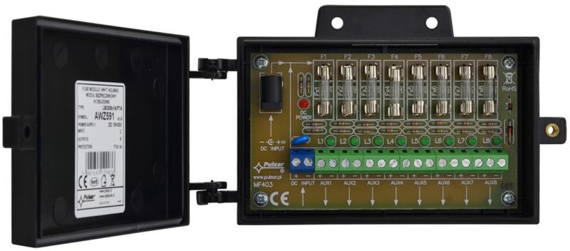 Модуль предохранителей LBC8/8x1A/FTA в корпусе Питание: 10÷30 В постоянного тока Мощность: 8x1A – ТЕМА Сечение провода: макс. 2 мм2 Количество входов/выходов: 2/8 Защиты: SCP, OLP*, перенапряжение Дополнительные функции: – дополнительный вход питания – гнездо