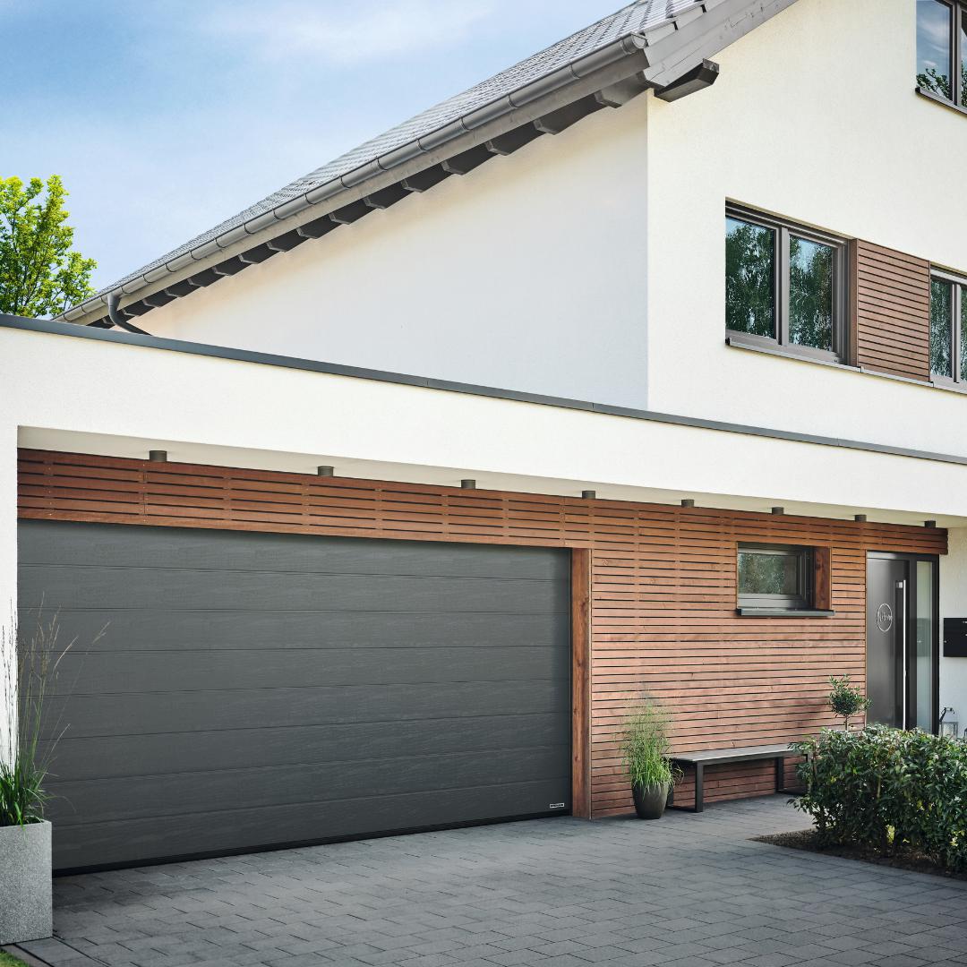 Гаражные ворота от известной немецкой компании Hormann, модель Renomatic, полностью укомплектованы. Полноразмерные сегменты толщиной 42 мм гарантируют высокую теплоизоляцию, устойчивость и бесшумность ворот. Все внутренние поверхности ворот имеют высококачественное покрытие RAL 9002 (бело-серый), обеспечивающее эффективную защиту от коррозии.