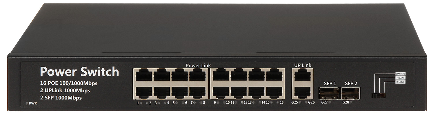 10/100/1000 Мбит/с: 16 портов LAN и PoE + 2 порта RJ-45 / SFP для восходящего канала
