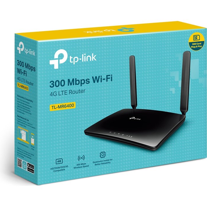 Беспроводной маршрутизатор 4G LTE, стандарт N, 300 Мбит/с TL-MR6400 Поделитесь своим 4G LTE-соединением в беспроводной сети на скорости до 150 Мбит/с Встроенные мощные антенны обеспечивают стабильное соединение и большое рабочее поле Не требуется настройка, просто вставьте SIM-карту Скорость беспроводной сети до 300 Мбит/с Порт LAN/WAN позволяет создать дополнительное подключение к Интернету Благодаря встроенному модему 4G LTE и слоту для SIM-карты просто вставьте SIM-карту и включите устройство, и маршрутизатор автоматически подключится к сети вашего оператора и предоставит общий доступ к этому соединению вашей домашней беспроводной сети. TL-MR6400 предлагает непревзойденное удобство и универсальность. Возможность быстрой настройки беспроводной сети может быть очень полезной. Работаете ли вы дома, в офисе или в дороге, просто подключите TL-MR6400, вставьте SIM-карту, и все готово.