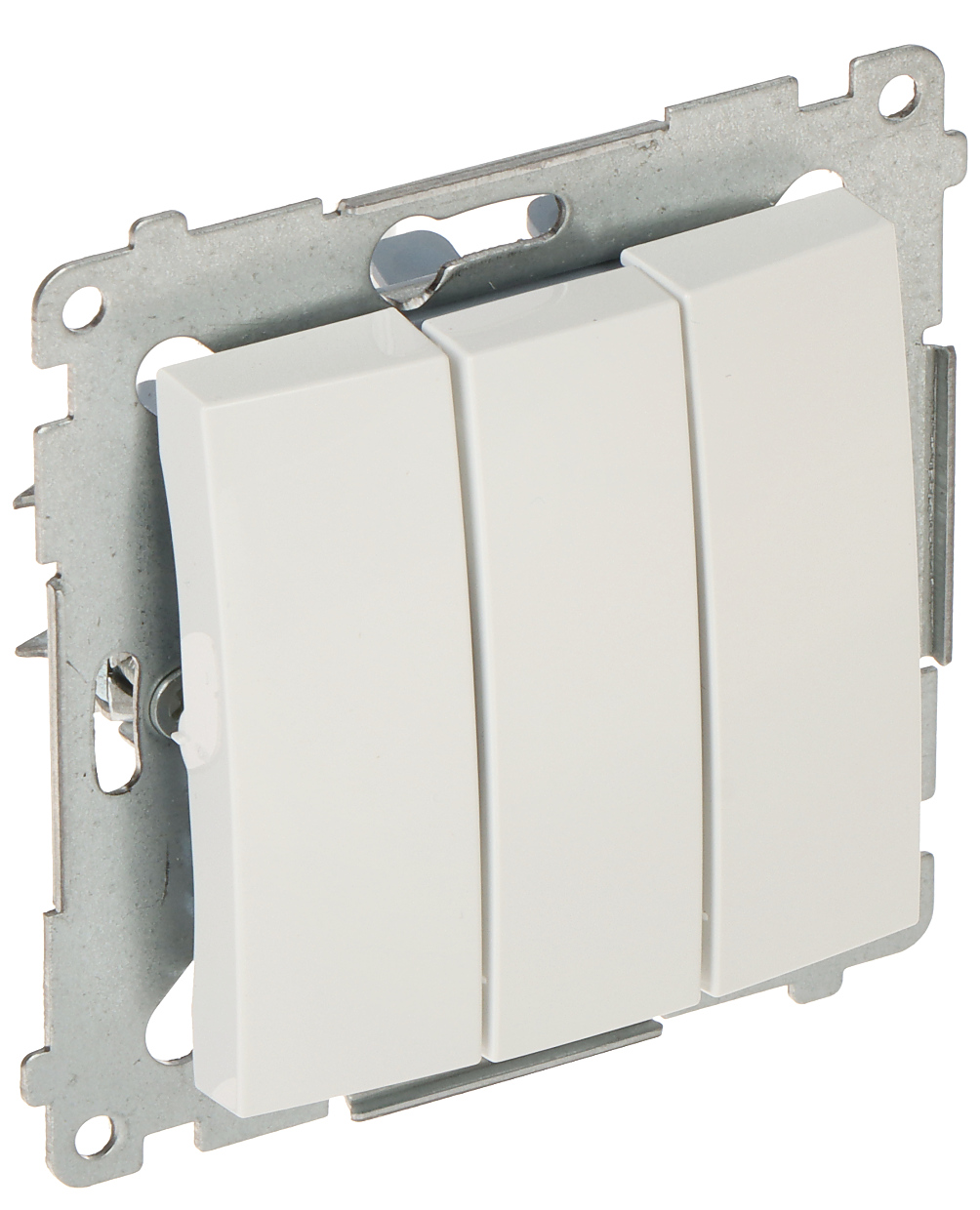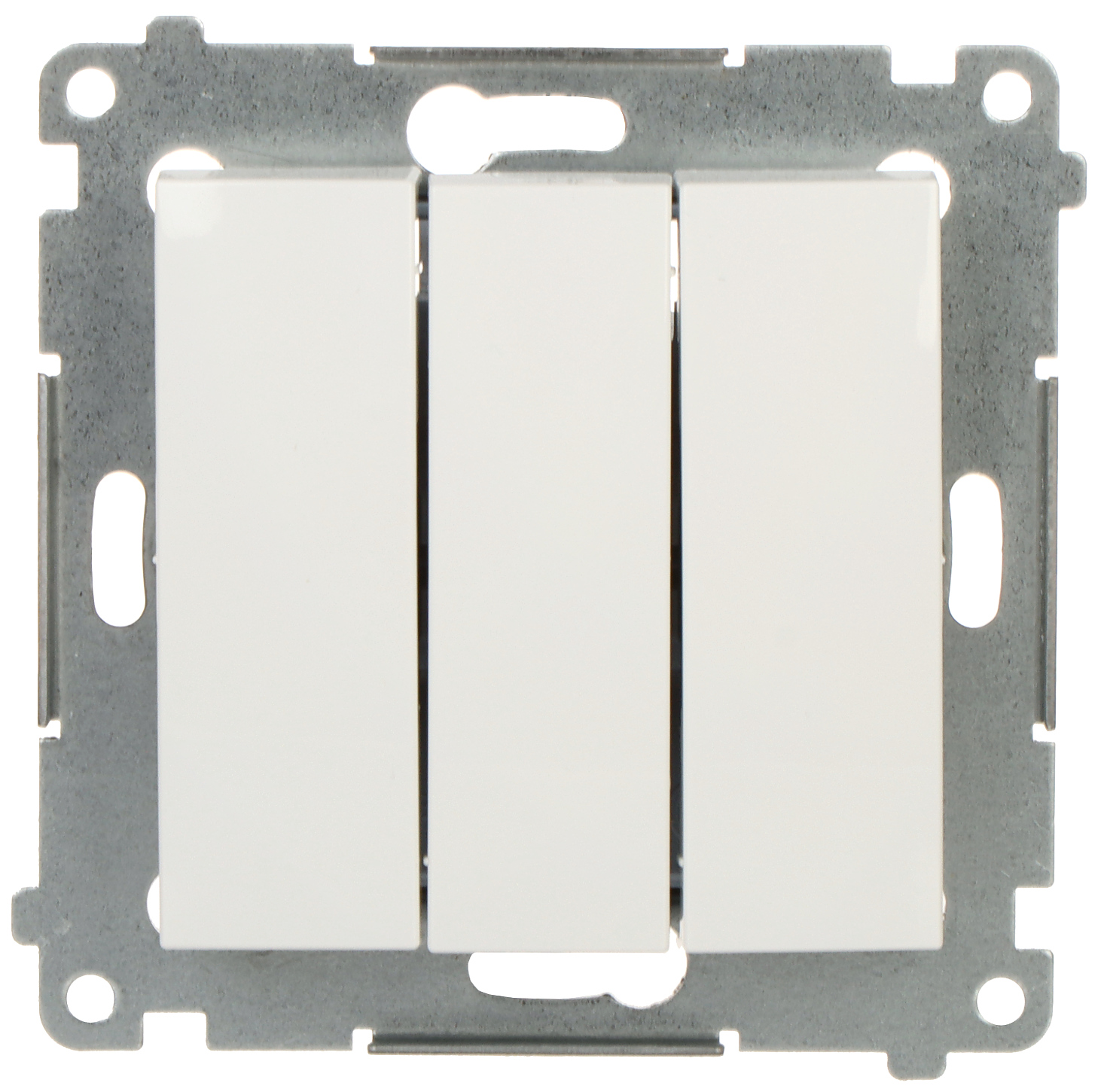 Тип устройства: Тройной переключатель (бистабильный) </span>;>Номинальное напряжение: 250 В переменного тока </span>;>Номинальный ток: 10 А (индуктивная нагрузка) </span>;>Тип разъемов: Быстрые соединители </span>;>Освещение: синий светодиод </span>;>Цвет: Белый (RAL 9003) </span>;