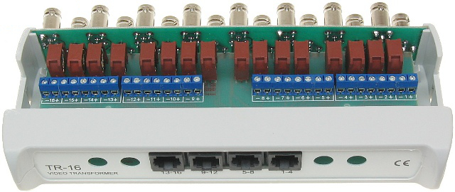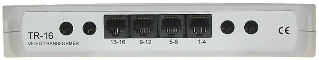 Устройство TR-16 предназначено для передачи видеосигнала с шестнадцати камер по витой паре. Устройство согласует сопротивление коаксиального кабеля сопротивлением 75 Ом с сопротивлением симметричного кабеля, обеспечивая передачу видеосигнала на расстояние до 400 м.