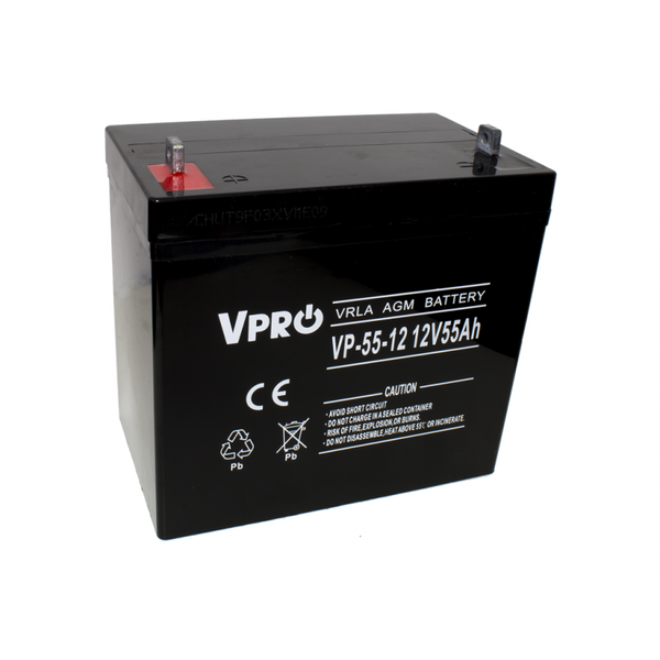 преобразователи Ряд VPRO 55 Ач батареи производятся с использованием AGM (Впитывающий стеклянный мат) VRLA технологии и предназначены в основном для использования в системах аварийного электроснабжения (ИБП, системы автоматизации), преобразователях солнечной энергии и преобразователях напряжения. Они лучше всего работают в системах плавающей зарядки., но может также использоваться в приложениях, где батареи цикличны. При глубине разряда до 50% имеют около 650 рабочих циклов.. Расчетный срок службы составляет 8-10 лет при эксплуатации при температуре около 20-25 градусов Цельсия. Аккумуляторы AGM VRLA имеют характерную внутреннюю структуру на основе стекловолоконных сепараторов.В аккумуляторе, в котором сосредоточен электролит, между свинцовыми пластинами расположены сепараторы. Дополнительной особенностью этого типа аккумулятора является наличие автоматической системы герметизации. (клапаны давления – регулируемые). Клапаны открываются при обнаружении избыточного давления в аккумуляторе, обеспечивая безопасный выход образующегося газа за пределы корпуса, предотвращая повреждение. Чаще всего такая ситуация возникает при перезаряде аккумулятора. Корпус аккумулятора изготовлен из АБС-пластика, а нагревательные элементы – из меди. (40td). температура (25 °C):